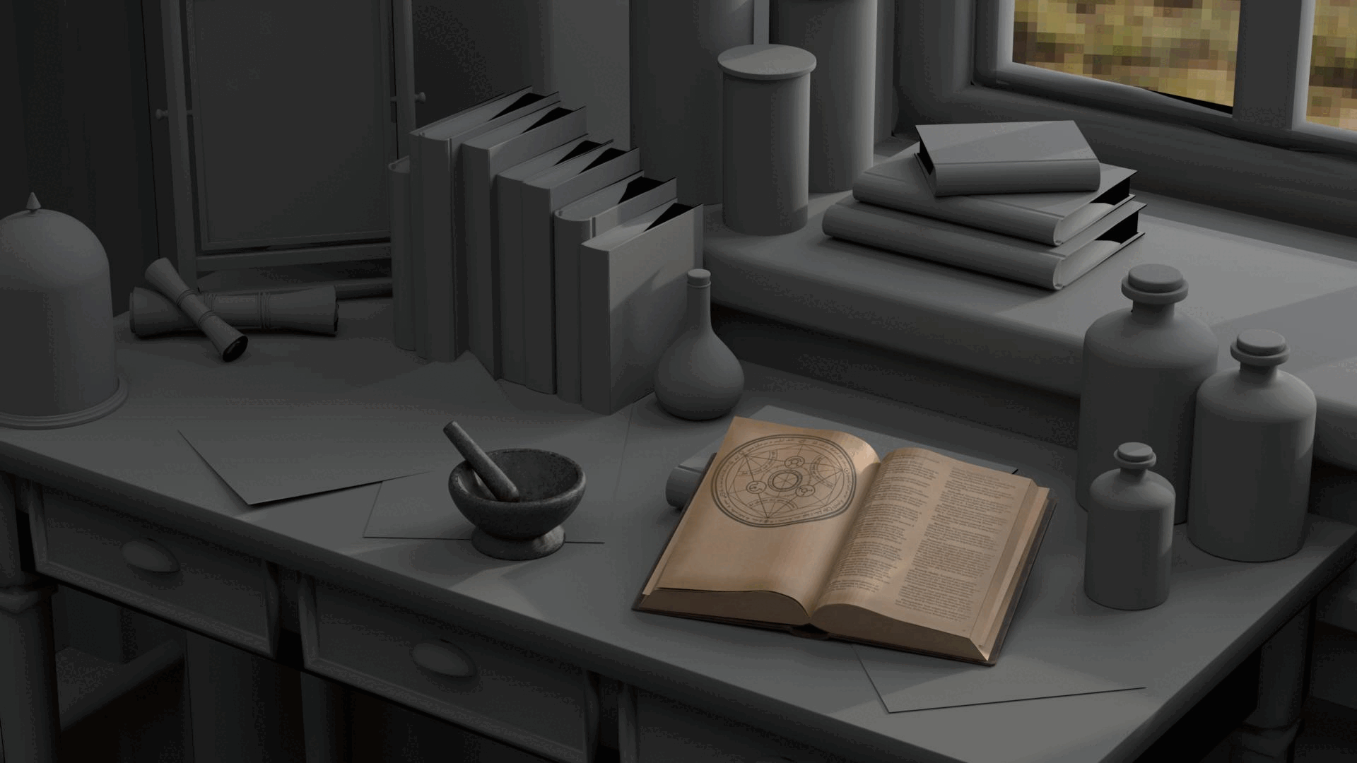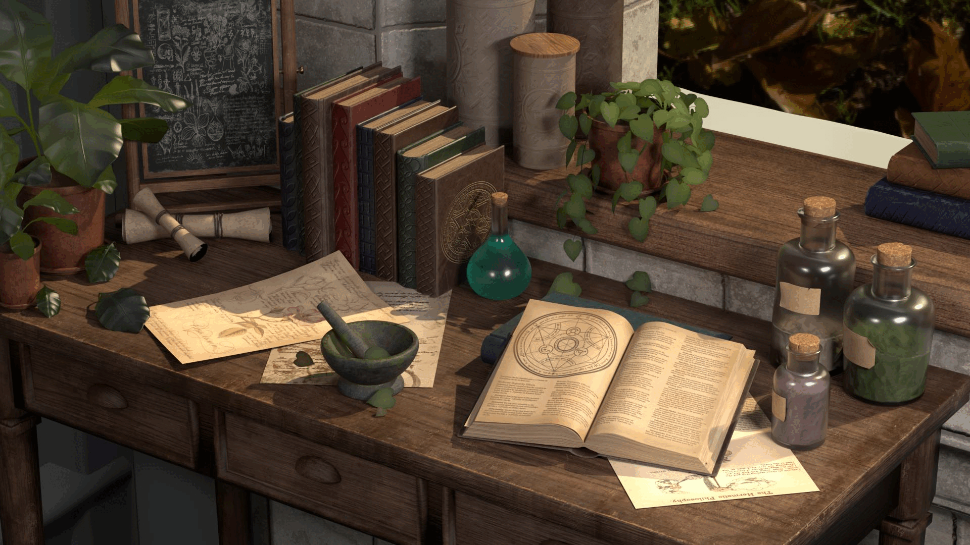 In 2024, I had the opportunity to undertake a project that allowed me to create a still-life composition. Drawing on my love for history, I chose to showcase the desk of an alchemist. This setting, rich in detail and atmosphere, reflects the essence of an ancient alchemist's study. By incorporating elements such as an open book with intricate diagrams, various tomes, scrolls, sketches, and a collection of alchemical tools, I wanted to create a scene that not only illustrates the study of alchemy but also evokes a deep sense of historical intrigue and intellectual curiosity. Along with this project, I wrote a research paper exploring how environments reflect an individual's personality, and I utilized this research to create the scene above!