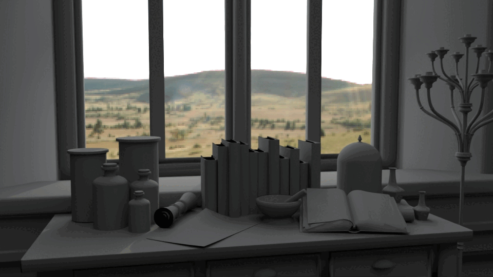 The GIF on the left showcases various stages in my composition creation process. Drawing from my research, I wanted to portray a personality comfortable in a clean environment yet capable of navigating through creative messiness, as seen in the stained pages beneath the mortar and pestle. I also incorporated an open book and an assortment of other books, scrolls, and sketches to help depict the personality of someone characterized by a strong desire to learn.